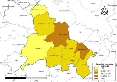 Carte des densités de population (millésimée 2016) des communes de la communauté de communes du Val de Vienne. Composition en communes au [4].