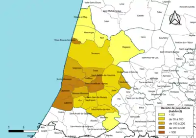 Carte des densités de population (millésimée 2016) des communes de la communauté de communes de Maremne-Adour-Côte-Sud. Composition en communes au [2].