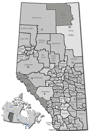 | No 349 Cold Lake | 12 | 0[8] | 5 804,56 | 0,0 | Se compose essentiellement de la base des Forces canadiennes Cold Lake sur le territoire de l'Alberta. | |||