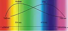 Comme la plupart des mammifères, les chiens ont seulement deux types de cônes photorécepteurs, ce qui fait d'eux des dichromates (ils ne voient que deux couleurs)[7],[8],[9],[10]. Leurs cônes photorécepteurs ont un maximum de sensibilité entre 429 nm et 555 nm. Des études comportementales ont pu mettre en évidence que le monde colorimétrique des chiens est composé de jaunes, de bleus et de gris[10], et qu'ils ont des difficultés à différencier le rouge du vert, comme les daltoniens deutéranopes humains. Quand un humain perçoit un objet comme rouge, cet objet apparait jaune au chien, et la perception humaine du vert correspond au blanc chez le chien. La « région blanche » (le point neutre) de la vision canine se situe aux alentours de 480 nm, une partie du spectre lumineux qui apparaitrait bleue-verte à un œil humain. Pour le chien, toute couleur correspondant à une longueur d'onde supérieure au point neutre ne peut pas être distinguée d'une autre et apparaît comme jaune[10].