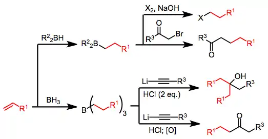 En synthèse organique, la réaction d'hydroboration est poussée plus loin pour générer d'autres groupes fonctionnels à la place du groupe du bore. La réaction d'hydroboration-oxydation (en) offre une voie vers les alcools par oxydation du borane avec le peroxyde d'hydrogène, ou vers les composés carbonylés avec un oxydant plus fort comme le trioxyde de chrome.
