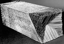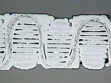 - Plaques en CVI-SiC/SiC à structure de fibres tridimensionnelle, pour le revêtement des domaines chauds les réacteurs de fusion[24]. La structure tridimensionnelle facilite la conduction thermique perpendiculairement à la surface. Comme le SiC s'est montré relativement stable dans un environnement irradié par des neutrons, on utilise ici des fibres de SiC cristallin, dont la stabilité à haute température s'avère bien meilleure que le SiC amorphe.