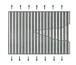La mise en tension forme dans la matrice des fentes, comme dans le matériau non composite, pour des allongements supérieurs à 0,05 %, selon le type de matériau, et les fibres forment un pont à travers la fente. Ce mécanisme suppose que la matrice peut glisser le long des fibres, c'est-à-dire n'est que faiblement liée mécaniquement à elles. Si l'adhésion entre la matrice et les fibres était forte, les fibres subiraient dans l'ouverture de la fente un allongement extrême et devraient y résister, ce qui n'est pas le cas. Ceci signifie que dans le cas d'une forte adhérence, la fente de la matrice casserait aussi les fibres, et la céramique composite présenterait le même comportement fragile que la céramique non renforcée.