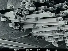 Avec ces propriétés, les fibres peuvent aussi être tissées en structures à deux ou trois dimensions (voir figure). Dans le travail, par exemple le tissage, les fibres doivent présenter de hautes résistances à la traction et résister à de petits rayons de courbure.