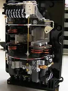 Dans les compteurs électromécaniques du XXe siècle, le comptage de l'énergie s'effectue en comptant le nombre de rotations d'un disque animé par des courants de Foucault[7]. Leur principe de fonctionnement est basé sur l'électromagnétisme[8],[9],[7]. Un disque mobile (généralement en aluminium) monté sur un axe tournant entraîne un mécanisme de comptage mécanique. Ce disque est soumis aux champs magnétiques alternatifs produits par deux électroaimants disposés à sa périphérie avec des axes parallèles, l'un est parcouru par le courant circulant dans le fil de phase et l'autre par un courant proportionnel à la tension du réseau[8],[9],[7]. Ces deux champs magnétiques, qui sont en quadrature (décalés de 90°) et dirigés perpendiculairement par rapport au disque, y induisent des courants de Foucault, lesquels, en induisant un champ magnétique opposé (loi de Lenz-Faraday) déterminent la rotation du disque (principe identique à celui de la machine asynchrone)[8],[9],[7] par l'effet d'un couple moteur proportionnel au double produit du courant par la tension et par le cosinus du déphasage entre ces grandeurs (puissance active instantanée). Le disque passe entre les pôles d'un aimant permanent, disposé également à sa périphérie et créant un couple résistant amortisseur qui permet également le réglage du compteur[8],[9],[7]. Après étalonnage, un tour du disque détermine la constante du compteur en Wh/tour.