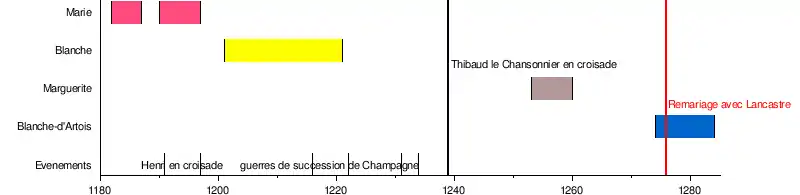 Le fils aîné du comte et de la comtesse, Henri, est élu en 1192 roi de Jérusalem. En 1201, le neveu et successeur de celui-ci, Thibaud le Chansonnier, hérite de son père mort quelques jours avant sa naissance la pairie de France et de sa mère le royaume de Navarre. C'est à celle-ci qu'échoit, trois ans après la mort de Marie de France, la régence. Elle fixe à Provins sa résidence et celle de ses successeurs. La capitale comtale devient une ville spécialisée dans le « ners de Provins », étoffe de laine produite par les innombrables moutons de la « Champagne pouilleuse », puis teinte en noire dans le Durteint et certifiée par le sceau de la corporation des maîtres tisserands. Elle devient aussi la capitale de la mode, qui est dessinée en Italie et portée tant à la cour qu'à la ville.