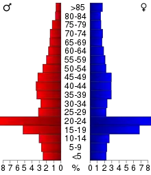 19,4 % de la population ont moins de 18 ans, 25,1 % entre 18 et 24 ans, 23,1 % entre 25 et 44 ans, 18,6 % entre 45 et 64 ans et 13,8 % ont plus de 65 ans. L'âge moyen est de trente ans. La population comporte 50,1 % de femmes et 49,9 % d'hommes. Pour les plus de 18 ans, la proportion passe à 50,8 % de femmes et 49,2 % d'hommes[1].