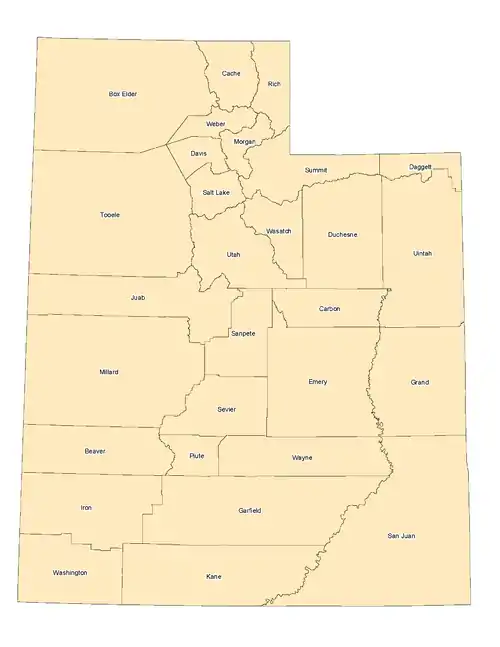 - Salt Lake, créé en 1852. Appelé comté de Great Salt Lake jusqu'en 1868.