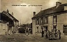 La Première Guerre mondiale apportera son lot de malheurs également, 31 Condéens sont morts au champ d’honneur, le village verra passer les troupes allemandes en septembre 1914 repoussées par la suite après leur défaite aux marais de Saint Gond. Le village servira de base arrière pour les troupes françaises (9e et 24e Dragons, 4e Chasseurs à cheval, 3e et 4e bataillons du 4e régiment de zouaves, 10e régiment d’artillerie). L’évènement le plus traumatisant de cette guerre est sans aucun doute le bombardement du village le 2 Mai 1917 vers 22 h 30 par des Gothas G de la Luftwaffe qui tua un soldat, en blessa deux autres au niveau humain et côté matériel détruisit une grande partie de l’église, l’école des filles, la garderie, deux bombes tombèrent dans les rues ne faisant que des dégâts légers (vitres et vitrines des magasins) et une dernière tomba dans une étable tuant quatre vaches et blessant des chevaux. Il faudra attendre 1925 avant de voir l’église restaurée.