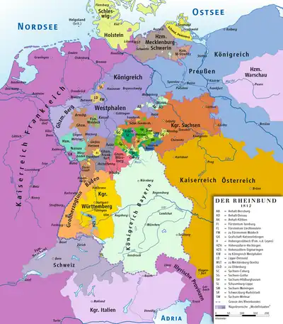 En 1815, le congrès de Vienne redessine la carte politique du continent. La reconfiguration territoriale, particulièrement dans le nord de l'Allemagne, est importante. Les créations napoléoniennes — le royaume de Westphalie, les grands-duchés de Berg, de Würzburg et de Francfort — sont abolies et les États supprimés par Napoléon — notamment l'Hanovre, les duchés de Brunswick, le Hesse-Cassel et l'Oldenbourg — sont recréés. La Prusse regagne le terrain perdu et fait des gains territoriaux importants sur le Rhin, en Westphalie et en Hesse. Le royaume de Saxe, trop longtemps fidèle à Napoléon, perd le tiers de son territoire, de même que le grand-duché de Hesse. Par contre, la plupart des anciens membres de la confédération du Rhin situés au centre et dans le sud de l'Allemagne survivent avec des changements de frontière plus ou moins importants. À l'instar des États qui ont été recréés, ils vont se joindre à la nouvelle Confédération germanique formée sous l'égide de la Prusse et de l'Autriche, la présidence étant réservée — à titre héréditaire — à l'empereur d'Autriche (ex-souverain élu du Saint-Empire romain germanique).