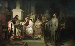Le thème du concours pour la grande médaille d'or a été annoncé au début de l'année 1870 : Confiance d'Alexandre le Grand en son médecin Philippe[5],[21]. Ce n'était pas le premier concours académique sur ce sujet. En 1830, les peintres historiques s'étaient vu proposer de : « Représenter Alexandre le Grand au moment où, étant malade et ayant reçu une lettre de dénonciation suivant laquelle son médecin Philippe voulait l'empoisonner, il ne croit pas en cette dénonciation et prend le médicament, tout en donnant à Philippe la lettre de dénonciation pour qu'il la lise »[22]. C'est le peintre Jan Ksawery Kaniewski qui se voit attribuer la médaille d'or de second rang lors du concours de l'année 1830 pour son tableau Confiance d'Alexandre en son médecin Philippe[23]. Par ailleurs, en 1836, un dessin sur le même thème d'Alexandre et Philippe est réalisé par Taras Chevtchenko alors qu'il est encore étudiant à Saint-Pétersbourg[24].