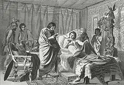 L'épisode représenté dans le tableau de Siemiradzki, est lié à une légende. Durant la campagne contre le roi de Perse Darius III, Alexandre de Macédoine, a cause d'un refroidissement, est tombé gravement malade. Les médecins craignaient de le soigner, de peur que les Macédoniens ne les sanctionnent au cas où ils ne réussissaient pas à la guérir et qu'il meurt. Selon l'historien Plutarque, Philippe, « voyant l'état grave du malade, a placé son amitié avant toute autre considération et a considéré criminel de ne pas utiliser tous les moyens possibles même s'il risquait des ennuis comme médecin ». Philippe a préparé un médicament puissant et l'a apporté au malade. Cependant, peu de temps avant de prendre le médicament Alexandre a reçu une dépêche urgente de son chef militaire dénommé Parménion, qui exposait dans son écrit que Philippe avait été soudoyé par Darius et qu'on allait lui donner du poison à la place du médicament. Lorsque Philippe donne la potion à Alexandre, ce dernier lui demande de lire la lettre qu'il vient de recevoir. Cette scène est représentée sur la toile: Alexandre fait entièrement confiance à son médecin et n'hésite pas à boire le médicament, pendant que Philippe lit avec surprise et indignation la lettre calomnieuse. Comme le remarque Plutarque, « c'était un spectacle étonnant et à méditer »[66].