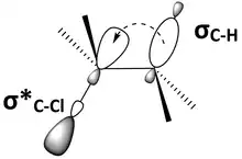 ![]() Figure 6 : l’orbitale de la liaison C–H est alignée sur l’orbitale antiliante de C–Cl et il se produit un phénomène d'hyperconjugaison. |