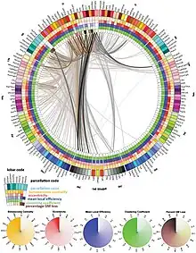 Il existe de nombreuses possibilités pour lesquels des mesures additionnelles peuvent être incluses dans les anneaux d'un connectogramme. Irimia et Van Horn (2012) ont publié des connectogrammes examinant les relations corrélatives entre les régions du cerveau. Ils ont également utilisé les diagrammes pour comparer la théorie des graphes et la connectomique[15]. Certains ont été publiés sans les cercles internes des mesures corticales[16]. D'autres variantes incluent des mesures additionnelles relatives aux réseaux neuronaux[17], qui peuvent être ajoutées comme anneaux additionnels à l'intérieur du connectogramme pour montrer illustrer la théorie des graphes, comme dans le connectogramme ci-contre :
