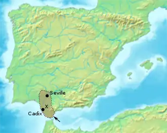 Tariq ayant établi une tête de pont dans le sud, Musa ben Nusayr, gouverneur d'Ifriqiya, débarque en Espagne la même année, avec une nouvelle armée de 10 000 à 18 000 hommes, d'origine arabe et syrienne[10],[11],[12], dans la ville de Cadix, et la place sous contrôle musulman. Les forces musulmanes, bien armées, conquièrent ensuite facilement, presque sans résistance, Medina-Sidonia. Puis elles vont assiéger Séville, mais celle-ci ne tombe qu'après un siège d'un mois.