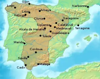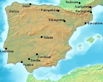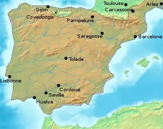 Au début du IXe siècle, les musulmans occupent la péninsule Ibérique, à l'exception du royaume des Asturies jusqu'en 925 et de la marche d'Espagne.