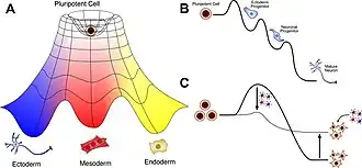 Il en donne un premier aperçu en 1932, en proposant un scheme selon lequel la différenciation cellulaire peut se comparer à « une boule poussée par un ensemble de forces le long d'une surface plane selon une suite de cônes »[6]. Cette intuition est à l'origine des interprétations mathématiques (topologie) de la morphogenèse[9].