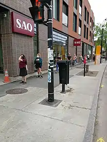 Plusieurs limitent le nombre de clients à l'intérieur de leurs bâtiments, ce qui engendre des files d'attente significatives devant plusieurs commerces[43]. Ils installent également une signalisation, dont notamment des marques au sol, afin d'aider les consommateurs à respecter une distanciation physique d'au moins 2 mètres entre les individus.