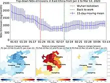 Une recherche conjointe réalisée par des scientifiques chinois et américains a estimé que les émissions d'oxydes d'azote (NOx=NO+NO2) ont baissé de 50 % dans l'est de la Chine entre le 23 janvier (confinement de Wuhan) et le 9 février 2020, comparé à la période du 1er au 22 janvier 2020[4]. Les émissions ont ensuite augmenté de 26 % entre le 10 février (jour de la reprise du travail) et le 12 mars 2020, indiquant une possible augmentation des activités socio-économiques après que la majorité des provinces aient autorisé les commerces à ouvrir[4]. Les mesures de contrôle du Covid-19 les plus efficaces pour contrôler la diffusion du virus avec un impact socio-économique moindre n'ont pas encore été étudiées[4].