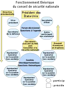 Le National Security Act du amendé le [5] prévoit la création d’un forum décisionnel composé du président, du vice-président et des secrétaires d’État et de la Défense. De fait, ses membres se sont souvent élargis à d’autres acteurs tels que le secrétaire du Trésor, le secrétaire au Commerce, le président du comité de chefs d’État-major (Chairman of the Joint Chief of Staff ou CJCS), le directeur des services de renseignement (qui est aussi le directeur de la CIA), l’ambassadeur des États-Unis à l’ONU. Plus récemment se sont ajoutés le directeur du renseignement national, le coordinateur de la lutte antiterroriste ou le secrétaire à la Sécurité intérieure. D’autres conseillers spécialisés peuvent ponctuellement intervenir en fonction des sujets traités.