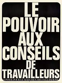 Par voie de tracts et d'affiches[11], le Conseil précise son programme. Le 22 mai : « la formation de Conseils de travailleurs, décidant démocratiquement à la base, se fédérant par délégués révocables à tout instant, et devenant le seul pouvoir délibératif et exécutif sur tout le pays »[12],[13]. Le 30 mai : « La dissolution de tout pouvoir extérieur ; la démocratie directe et totale ; l'unification pratique de la décision et de l'exécution ; le délégué révocable à tout instant par ses mandants ; l'abolition de la hiérarchie et des spécialisations indépendantes ; la gestion et la transformation consciente de toutes les conditions de la vie libérée ; la participation créative permanente des masses ; l'extension et la coordination internationalistes. »[14]