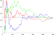 Graphe des suites associées à quelques constantes (rouge : π, bleu : γ, vert : 32), qui semblent tendre vers cette constante.
