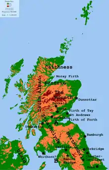 Le royaume de Kenneth et de ses successeurs s'étend au sud du Fortriu, autour de la vallée de la Tay. Il s'étend au moins jusqu'au Firth of Forth vers le sud et jusqu'au Mounth vers le nord ; ses frontières occidentales sont plus incertaines. Ses principaux centres religieux sont Dunkeld, où siège vraisemblablement l'évêque du royaume, et Cell Rígmonaid, l'actuelle St Andrews[22],[23],[24].