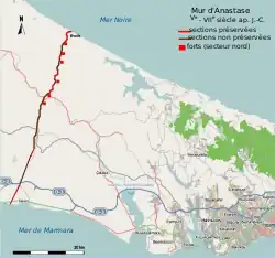 Le mur faisant face à la Corne d'Or où circulait la majeure partie du trafic maritime lors des derniers siècles de l'empire s'étendait sur une longueur totale de 5,6 kilomètres du cap de Saint-Démétrius aux Blachernes où il rejoignait les murailles terrestres. Il était construit à une certaine distance du rivage et mesurait à peu près 10 mètres de hauteur. Le rivage nord de la cité étant la zone la plus cosmopolite de Constantinople, c’était aussi un centre commercial important comprenant les quartiers réservés aux étrangers où certaines communautés avaient leurs jetées propres. Sur la Propontide, le rempart était construit presque sur la rive, sauf là où il protégeait des ports. Les murs y avaient une hauteur de 12 à 15 mètres et comprenaient 13 portes et 188 tours[128] pour une longueur totale de 8,46 kilomètres avec 1,08 kilomètre supplémentaire formant l'enceinte intérieure du port d’Éleuthérios.