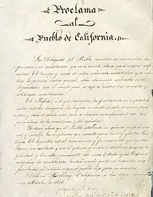 La section 21, article XI de la Constitution de 1849 décrétait que les lois devaient être publiées en espagnol et en anglais. Ainsi, pendant ses 30 premières années, la Californie fut un état bilingue. Cette disposition ne fut pas reprise dans la Constitution de 1879. La traduction espagnole a été écrite sur 45 pages d'un lourd papier blanc, mesurant 19 cm x 30 cm.