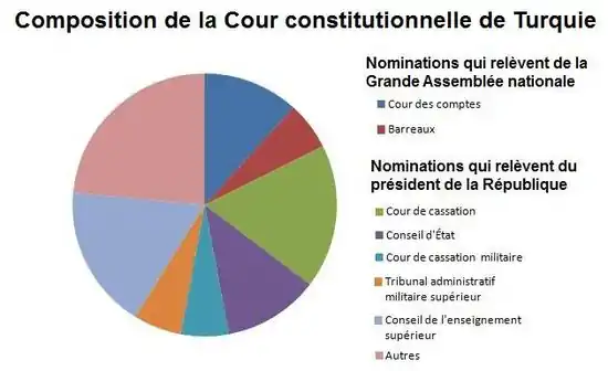 Lors de son adoption en 1982, la Constitution prévoyait que tous les membres de la Cour constitutionnelle étaient nommés uniquement par le président de la République. La réforme constitutionnelle de 2010 a modifié le processus de nomination, afin d'accorder à la Grande Assemblée nationale de Turquie le pouvoir d'élire trois des dix-sept membres. Selon le Dr. Musa Saglam, cette réforme vise à accroître la légitimité démocratique de la Cour[26].