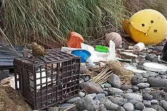 - les habitats intertidaux là où ils sont recouverts de débris se voient pollués, privés de lumière et reçoivent moins d'oxygène[46]. Leurs niveaux d'évaporation et leur température en sont modifiées, de même que les effets du mouvement de l'eau sur et dans le substrat[47], au détriment des communautés macrobenthiques et méiobenthiques naturelles[48]. Sur les plages et l'estran, les déchets de plastiques peuvent modifier la perméabilité et la température du substrat sableux, au détriment des animaux dont le sexe de l'embryon sera déterminé par la température, comme chez certains reptiles[47]. Un effet de colmatage est parfois possible, observé jusqu'en Papouasie Nouvelle-Guinée[49].