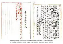 La Corée affirme également que la revendication du Japon de 1905 en tant que terra nullius est en contradiction avec sa reconnaissance antérieure (c'est-à-dire de l'ordre du Daijō-kan de 1877) des îlots en tant que territoire coréen[84],[85],[86].