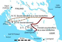Les Soviétiques exigeaient que la frontière avec la Finlande sur l'isthme de Carélie soit déplacée vers l'ouest jusqu'à un point à seulement 30 kilomètres à l'est de Viipuri, la deuxième plus grande ville de la Finlande, pour relier Koivisto à Lipola. En outre, les Finlandais devraient détruire toutes les fortifications existantes sur l'isthme de Carélie. Ils devaient également céder à l'Union soviétique les îles de Suursaari, Tytärsaari, et Koivisto dans le golfe de Finlande. Dans le nord, les Soviétiques exigeaient la péninsule de Kalastajansaarento. En outre, les Finlandais devraient louer la péninsule de Hanko aux Soviétiques pour une durée de trente ans et permettre aux Soviétiques d'établir une base militaire. En échange, l'Union soviétique céderait Repola et Porajàrvi, détachées de Carélie orientale, une région deux fois plus grande que le territoire réclamé aux Finlandais[35],[37].