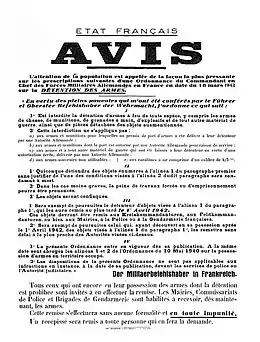 À la veille de la Seconde Guerre mondiale, le contrôle des armes est considérablement renforcé. Le décret-loi du , promulgué dans le but d'éviter une insurrection, prohibe les armes à feu[N 1]. Le régime de Vichy ira jusqu'à punir de mort la détention d'arme par les juifs indigènes d'Algérie[2], puis par tous les citoyens[3].