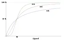 où représente la fraction des sites comportant un ligand lié, [L] est la concentration de ligand et est la constante de dissociation apparente. La constante n s'appelle la constante de Hill et décrit le degré de coopérativité de la fixation du ligand :
