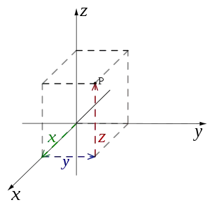 Le triplet de réels est uniquement déterminé par la position du point . Il s'appelle les coordonnées (cartésiennes) de dans le repère :
