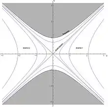 Les droites en coordonnées de Schwarzschild sont les hyperboles en coordonnées de Kruskal. Leurs asymptotes sont les bissectrices et . Les droites en coordonnées de Schwarzschild sont les droites passant par l'origine en coordonnées de Kruskal. Les singularités sont représentées par les frontières des zones hyperboliques grises sur le dessin ci-contre.