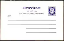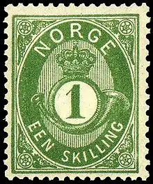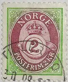 Un cor postal illustre une série de timbres-poste d'usage courant de Norvège. Le type dessiné par Wilhelm von Hanno est utilisé depuis le [1], ce qui en fait le type de timbre le plus ancien toujours en usage.