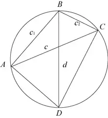 Formule des cordes consécutives : Soient trois points d'un cercle de diamètre , et étant situés de part et d'autre du diamètre issu de . Par application du théorème de Ptolémée, Les longueurs des cordes sont reliées par la relation [1].