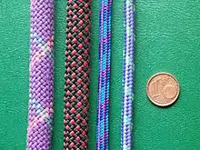 - Les cordes sont toujours utilisées en simple. Ce sont des cordes semi-statiques, sauf dans certains cas très particuliers ou pour la fabrication des longes. Leur diamètre se situe entre 8,5 et 10,5 mm. Des cordes d'un diamètre de 8 mm ne peuvent pas être homologuées relativement aux normes européennes et sont donc considérées comme des cordelettes au sens de ces normes[Note 1].