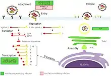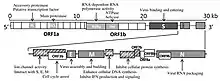 Après la fusion, la nucléocapside passe dans le cytoplasme, où le génome viral est libéré[49]. Le génome agit comme un ARN messager, dont le ribosome traduit les deux tiers correspondant au cadre de lecture ouvert ORF1a/ORF1b, en deux grandes polyprotéines qui se chevauchent, pp1a et pp1ab.