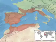 Cette espèce se rencontre dans le sud-ouest de l'Europe : dans le sud de la France, dans presque toute l'Espagne et le Portugal, et dans une partie de l'Italie au nord-ouest et au centre. On la trouve aussi en Afrique du Nord : au Maroc, en Algérie et en Tunisie[1].