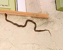 La coloration dorsale est variable. La couleur de fond peut être brunâtre plus ou moins foncé, gris souris, jaunâtre clair, ocre, rougeâtre ou rosâtre. S'y ajoute des motifs plus sombres, le plus souvent des petites barres irrégulières disposées en diagonale, parfois divisées en deux ou reliées par deux raies longitudinales. La couleur de ces motifs est également variable. Ils sont souvent bordurés irrégulièrement de noir. Presque chaque écaille est finement ponctuée de rouge ou noir[3]. Des tâches plus diffuses ornent les flancs.