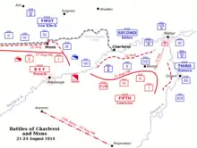 Le 21 août, alors que la Ve armée s'est fixé pour objectif d'agir contre le groupement ennemi du nord, accompagnée, à sa gauche, par les forces anglaises[44], l'ennemi attaque violemment Namur et atteint la Sambre où ses têtes de colonne entrent en contact avec les avant-postes français[45]. Le CC subit aussi la pression ennemie : à l'ouest de Charleroi, sa 3e division est débordée et contrainte de se porter encore plus à l'ouest, et la 1re division, dès lors menacée sur son aile gauche, nécessite l'intervention de la Ve armée[46] ; dans la soirée, le CC peut se replier vers Merbes-le-Château, entre Charleroi et Maubeuge, où il pourra encore garder certains ponts sur la rive sud de la Sambre[47].