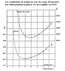 En ordonnées du graphe ci-contre à gauche sont les coefficients de Traînée K et K’ tels que les utilisait Eiffel et qui ne sont pas strictement adimensionnels[24]. K est le coefficient de traînée référencé à la section frontale des corps et K’ celui référencé à la puissance 2/3 du volume des corps[25],[23]. En 1927, dans la soufflerie du Nayy Aerodynamic Laboratory de Washington, Zahm, Smith et Louden mesureront la traînée de corps de mêmes sections, de formes homothétiques et d’allongement 1 à 10[26]. Ces mesures confirment les courbes établies par les chercheurs européens.