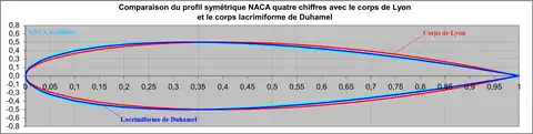 Bien que les profils d’ailes ne soient pas des corps de moindre traînée à surface frontale donnée ou à volume donné (on demande aux ailes d’être des corps de moindre traînée à surface alaire donnée), on peut quand même utiliser les équations qui génèrent les profils NACA quatre chiffres pour dessiner la forme de corps de moindre traînée à surface frontale donnée ou à volume donné[11]. Différentes formes évoquées ci-dessus sont comparées dans l'image ci-dessous :