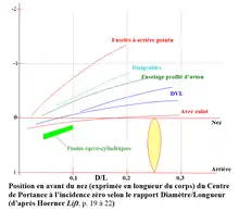 La détermination du centre de portance d'un corps de moindre traînée 3D[3] de révolution peut être faite à partir de la Théorie des corps élancés de Max M. Munk : en cas d'incidence accidentelle, l'avant-corps développe une portance classique (celle des ogives de fusées), mais l'arrière-corps, quoique se mettant en travers de l'écoulement (comme un empennage), développe contre intuitivement une déportance qui, conjuguée à la portance de l'avant-corps, tend à accroître l'incidence accidentelle. La Théorie des corps élancés surestime cependant la déportance d'arrière-corps d'un facteur proche de 2 (par rapport à la déportance réellement mesurée), ceci du fait de l'épaississement de la Couche limite à l'arrière du corps.