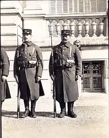 - les sentinelles de l'armée porteront et présenteront les armes, suivant le cas, aux officiers des compagnies de chasseurs forestiers ainsi qu'aux agents forestiers assimilés aux officiers revêtus de leur uniforme[43]. Il y aura réciprocité absolue de la part des sentinelles des chasseurs forestiers à l'égard des officiers de l'armée,