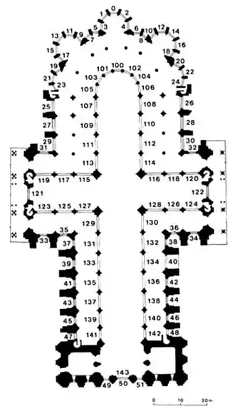Le niveau supérieur va de 100 à 199, suivant le même principe que pour le niveau inférieur. La baie 100 est la baie située dans l'axe du chœur.