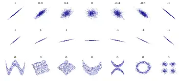 Le coefficient de corrélation linéaire est égal à 1 lorsque l'une des variables est une fonction affine croissante de l'autre variable et à –1 lorsque l'une des variables est une fonction affine décroissante de l'autre. Les valeurs intermédiaires renseignent sur le degré de dépendance linéaire entre les deux variables. Plus le coefficient est proche des valeurs extrêmes –1 et 1, plus la corrélation linéaire entre les variables est forte ; on emploie simplement l'expression « fortement corrélées » pour qualifier les deux variables. Une corrélation égale à 0 signifie que les variables ne sont pas corrélées linéairement, elles peuvent néanmoins être corrélées non-linéairement, comme on peut le voir sur la troisième ligne de l'image ci-contre.